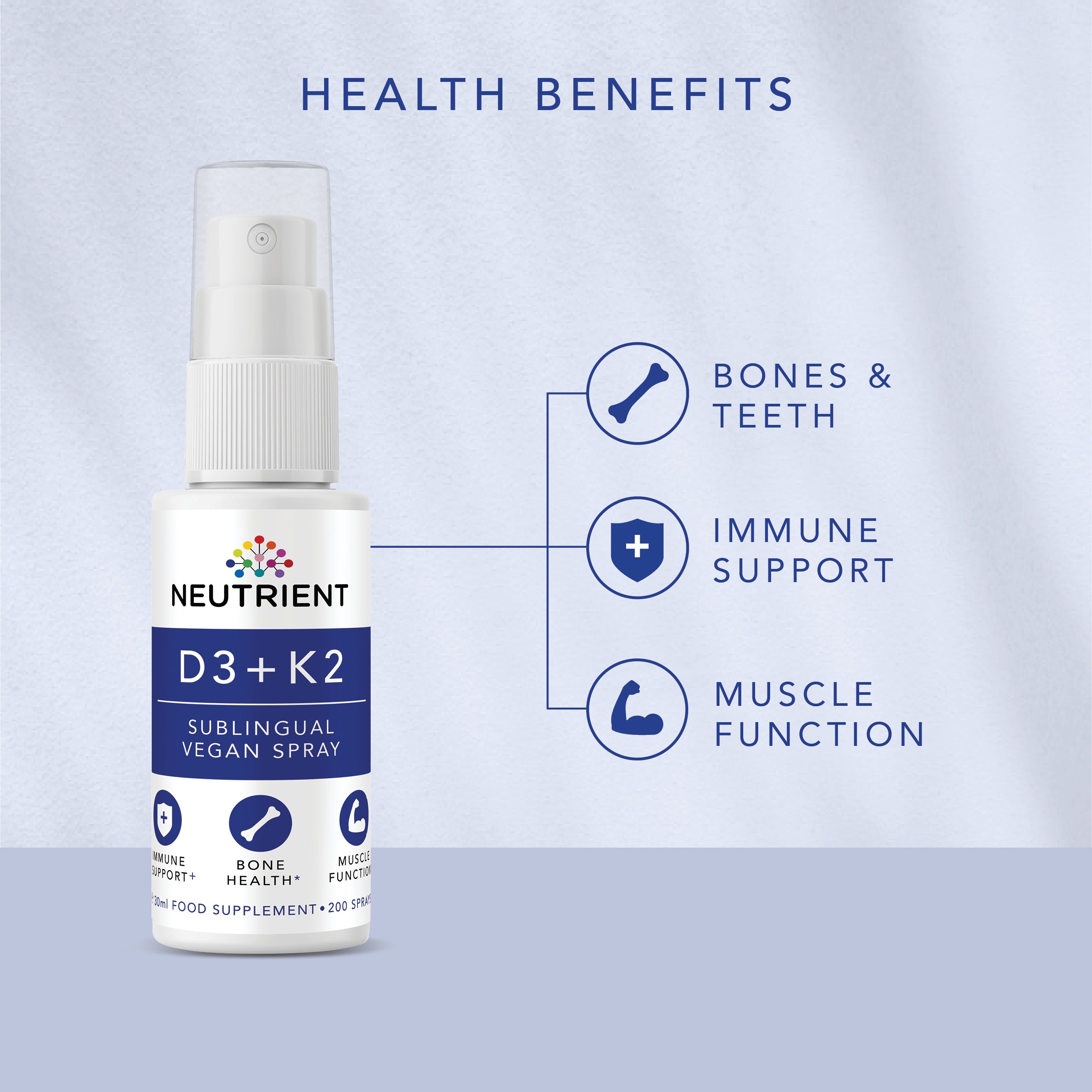 Neutrient D3+K2 es un aerosol vegano sublingual avanzado que ofrece una absorción maximizada de formas bioactivas de vitaminas D3 y K2, lo que favorece la función inmunológica y la salud ósea.